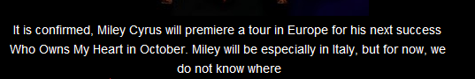 Traducción: "Esta confirmado, Miley Cyrus hará su primera gira en Europa con el éxito de su próxima "Who Owns My Heart", en octubre. Miley estará especialmente en Italia, pero por ahora, todavía no se sabe dónde. "